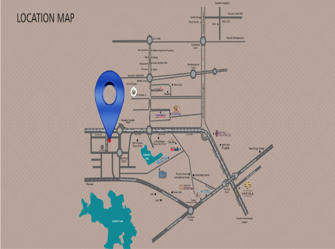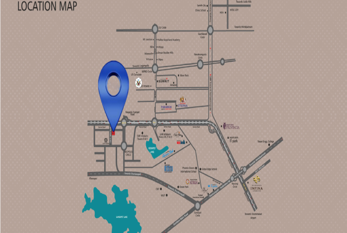 Introducing Rajapushpa Skyra at Neopolis, a prime location off Outer Ring Road. A destination of prime luxury, Neopolis is the abode to luxurious and ultra-luxurious residential developments that will soon redefine the skyline of West Hyderabad. Neopolis at West Hyderabad is renowned for its blend of urban sophistication and natural beauty, providing a serene yet connected lifestyle. Situated in this upscale neighbourhood, our residential project, Rajapushpa Skyra at Neopolis redefines what it means to live in luxury. Our newly launched luxurious residential project at Neopolis boasts a prime location that offers both convenience and exclusivity. Residents can enjoy easy access to the city’s major landmarks, premium shopping destinations, gourmet restaurants, top-tier schools and world-class healthcare facilities.