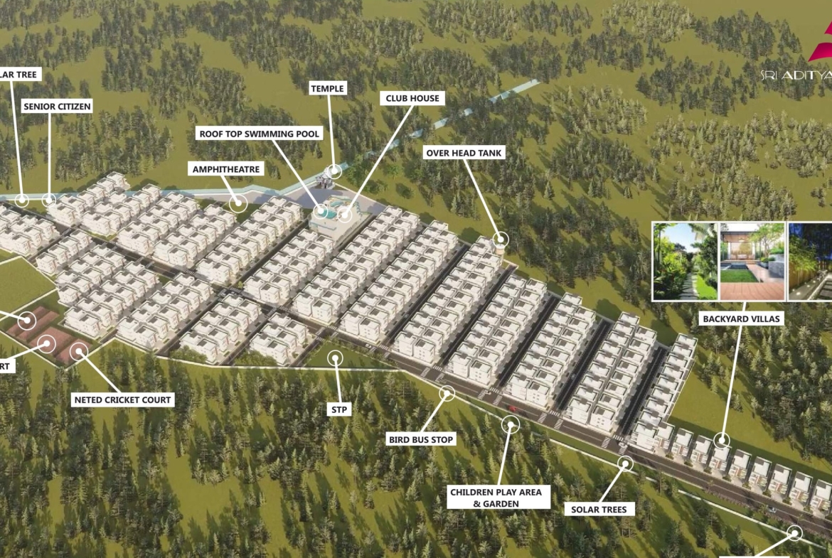 This is an HMDA and RERA-approved Gated Community Villa project in Hyderabad by Sri Aditya Squares N, offering Luxury Gated Community Villas in Patancheru Hyderabad. Beeramguda, beside ORR exit no.4 (Sultanpuri) near Rameswaram Banda. RERA Registration No. P01100005569. It is 21 acres long, has 274 luxury duplex and triplex villas in Hyderabad, and has world-class amenities.