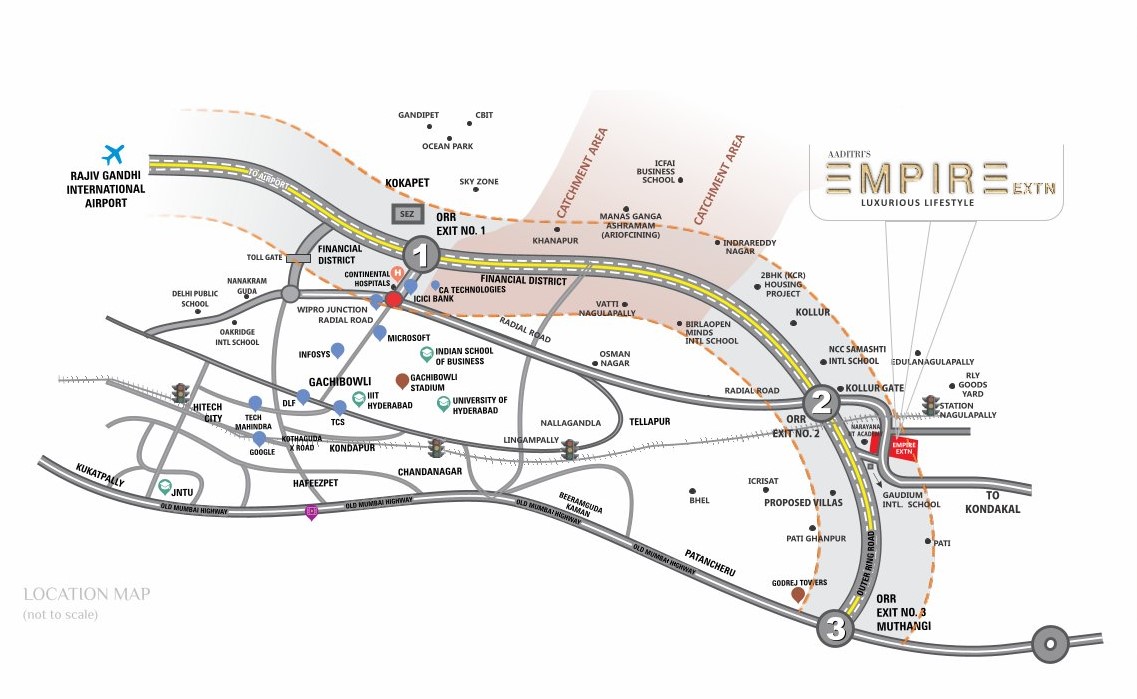 Aaditri Empire is located in a rapidly developing area near the Hyderabad Outer Ring Road (ORR) at ORR Exit: 2, offering excellent connectivity to major IT hubs, commercial districts, and the city center, while providing a tranquil environment away from the urban hustle. Key location advantages include proximity to schools, hospitals, public transport, and entertainment options, as well as the prospect of future growth in the region, making it a desirable residential investment.
