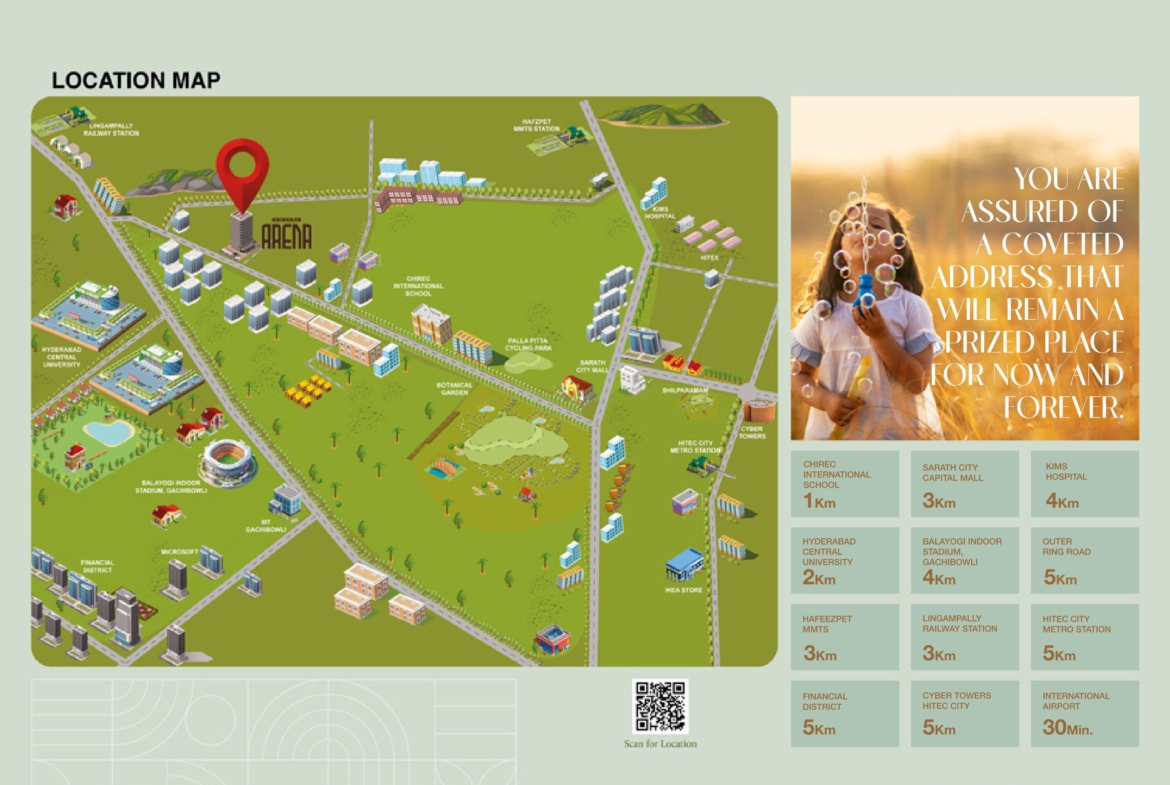 Located in Kondapur, it’s just minutes from the Botanical Garden and Pala Pitta Cycling Park, blending urban convenience with natural tranquility. Krishna’s Arena offers unparalleled lifestyle benefits, meticulously designed to provide comfort, convenience, and indulgence. With lush green landscaping, an elaborate terrace garden, every space reflects diligent planning, ensuring that residents experience the best of luxury living. Live the future of luxury—where elegance, efficiency, and ecology are perfectly in balance.